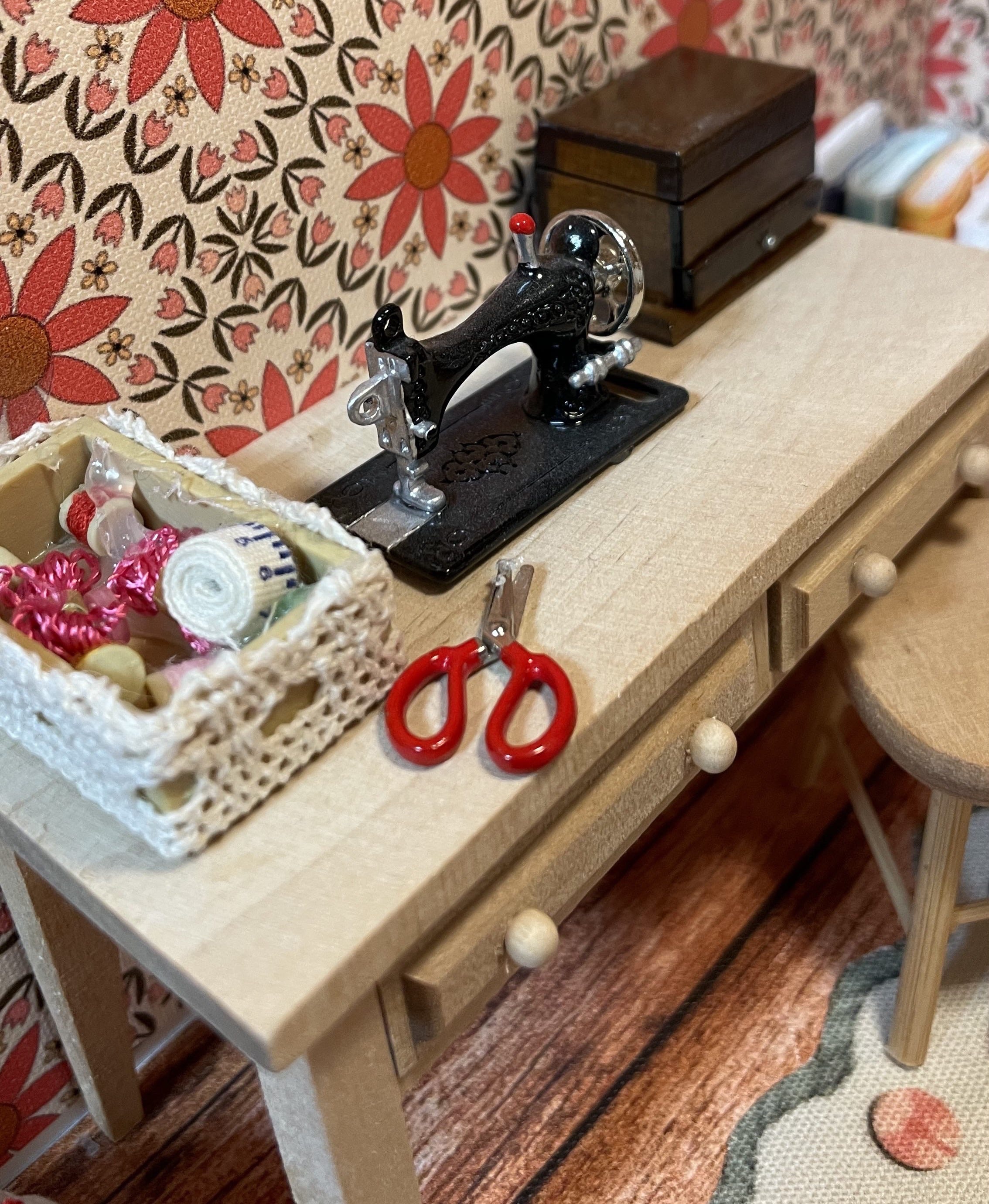 The table holds an antique sewing machine, scissors, a basket of supplies (including a measuring tape), and a sewing box.